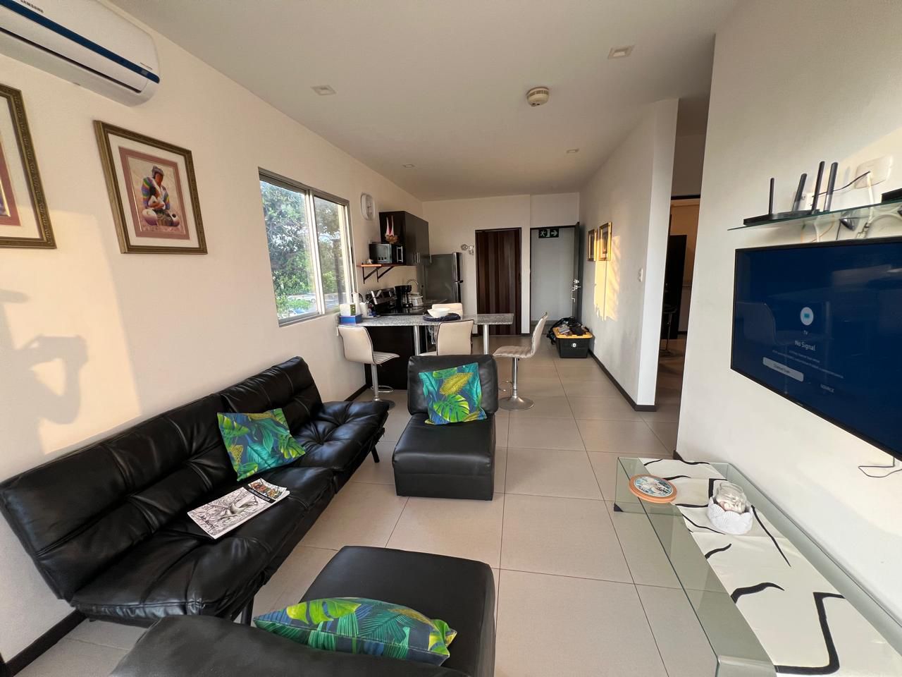 – Consiste de una amplia zona de cocina y sala totalmente equipada con línea blanca completa, aire acondicionado, muebles de sala con televisor con cable.